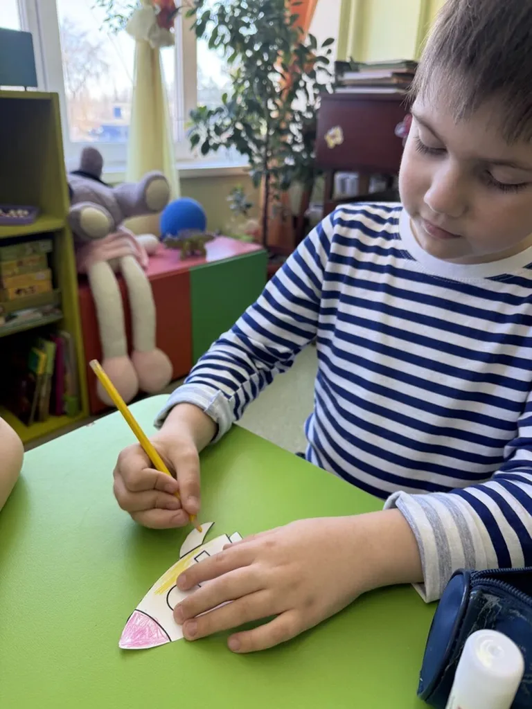 Для формирования чувства патриотизма, ответственности и гордости за достижения Родины в Центральной детской библиотеке им. С. В. Михалкова на творческом кружке «Волшебный мир творчества» библиотекарь с детьми провела тематическую беседу, а также изготовили поделку своими руками «Ракета». Для этой поделки много не понадобилось: всего лишь раскраска ракеты, цветные карандаши, клей, ножницы, цветная бумага.